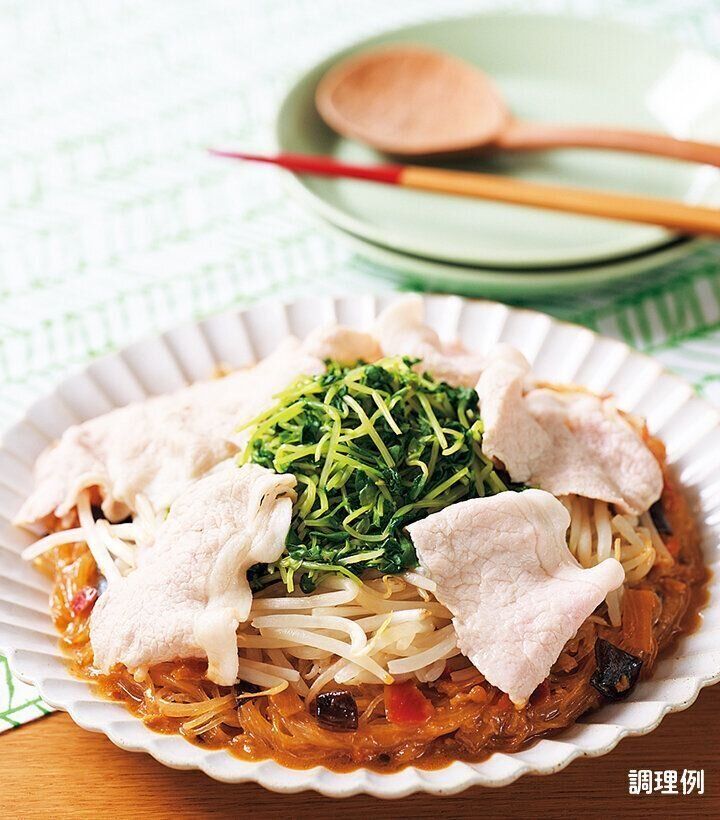 ①耐熱皿に、水と具入りソースを入れて混ぜ、春雨を加える。もやし、半分に切った豆苗をのせ、その上に豚肉を並べる。