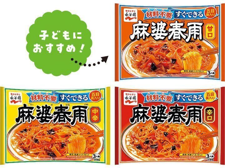 ご飯に合う、鉄板おかず。つるつるもちもちの春雨に、白湯ベースの麻婆ソースがよくからむ! 具材入りだからそのままでも、野菜やお肉でアレンジしても◎ 「麻婆春雨」上段:甘口、下段左から:中辛、辛口/各¥325(税抜き、希望小売価格)